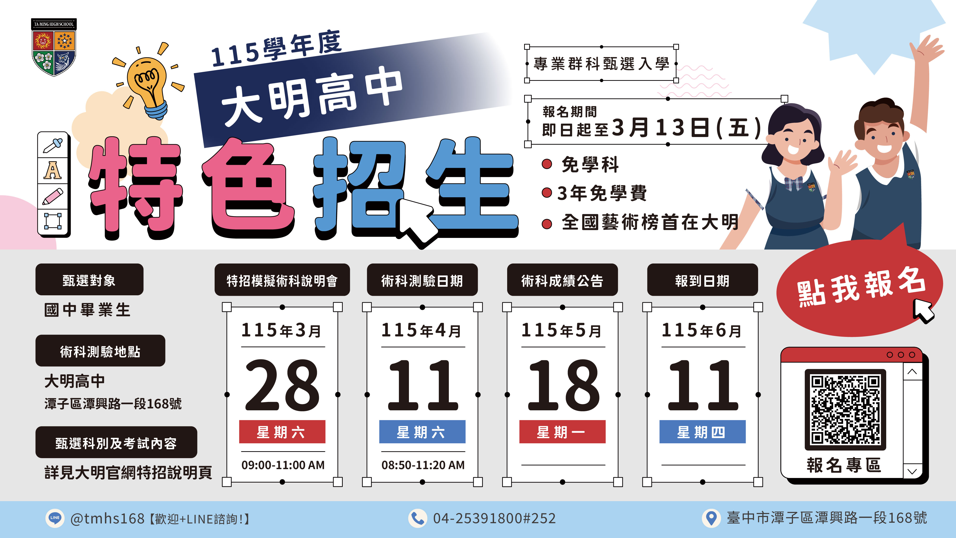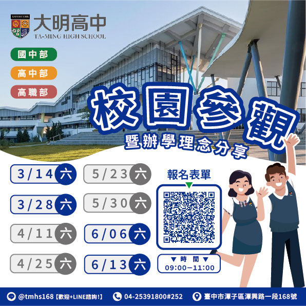 大明提供一個充滿活力與創意的藝術學習環境,讓每位學生都能發揮潛能,追求卓越。無論是追求學術成就,還是希望發展個人興趣,大明都將是每一位學生的理想之地。